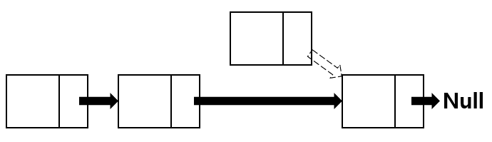 ‘추가’는 원하는 노드를 하나 만들고 그 노드와 Tail노드의 next pointer를 연결하는 작업입니다. 마찬가지로 처음부터 끝까지 순회하면서 마지막 노드가 가리키고 있는 Null 위치에 우리가 원하고자 하는 노드를 추가 시키는 개념입니다. ArrayList와는 달리, 끝 노드를 찾아야 하지 않아도 되고 그저 tail노드에서 새로운 노드를 추가하는 것이기 때문에 O(1)의 시간 복잡도를 갖습니다.